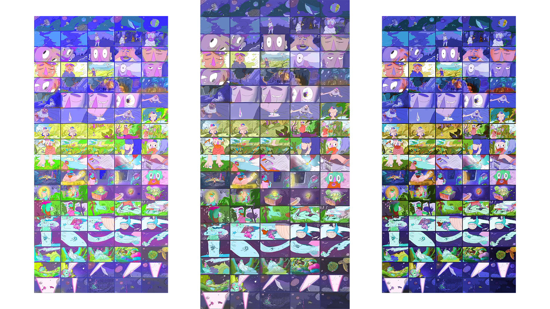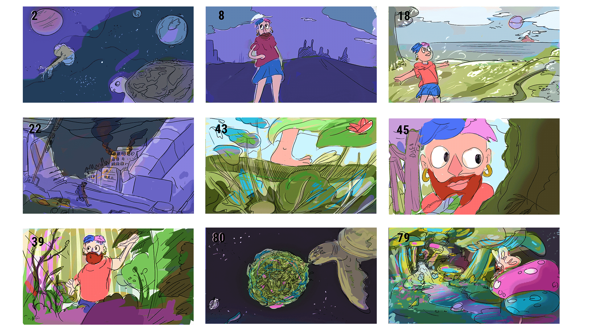 With the sketch phase completed, it's time to move into the design, but we have to talk about color before we can do that. Creating a color script will give us a sense of the color we will use in the video and how it evolves. It is the perfect birds-eye-view of the color scheme: