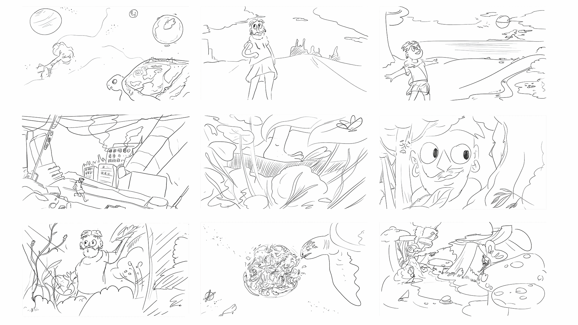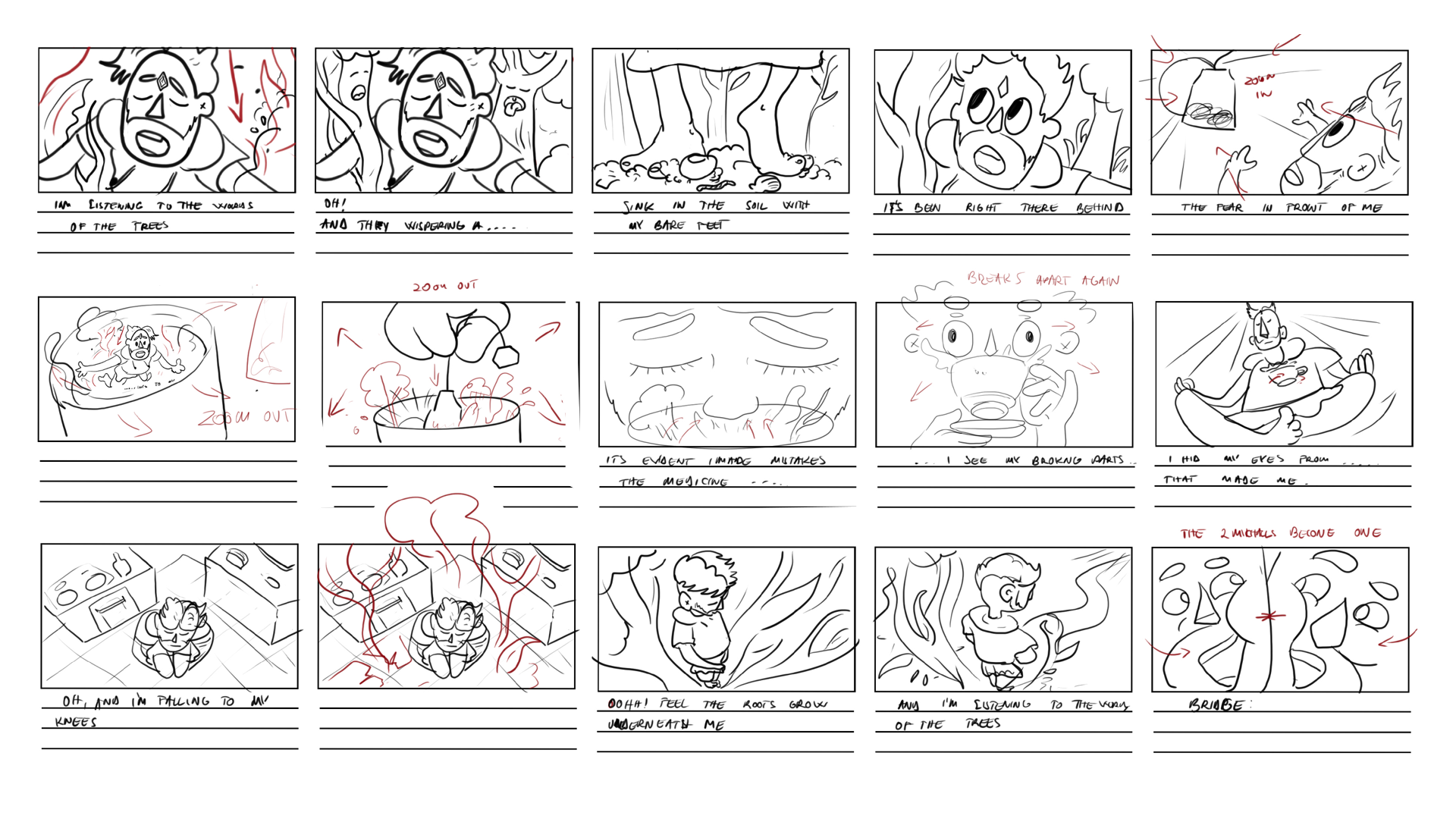 Since the video is over three minutes long, we start with a sketching phase that covers all of the lyrics and addresses all of the themes in the song. This rough storyboard gives us a bird's eye view of the visuals.
